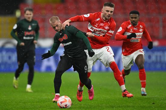 Lokomotiv's Dmitry Barinov and Spartak's Daniil Denisov struggle for the ball during the Russian Premier-League soccer match between Spartak Moscow and Lokomotiv Moscow, in Moscow, Russia.23.11.2024#8811587