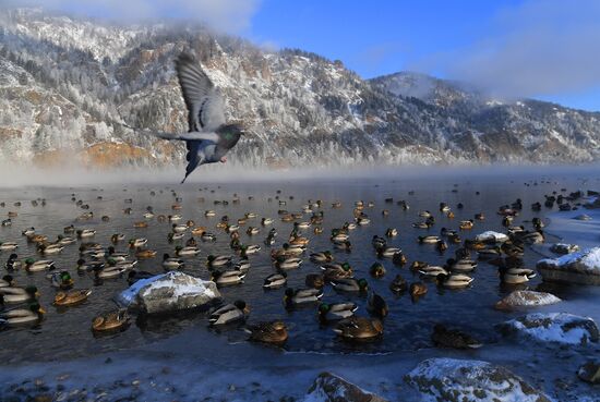 A pigeon flies over a flock of wild ducks swimming in the Yenisei River with the air temperature below 20 degrees Celsius (minus 4 degrees Fahrenheit) outside Divnogorsk, Krasnoyarsk region, Russia.18.12.2024#8830551