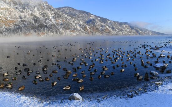 A flock of wild ducks swims in the Yenisei River with the air temperature below 20 degrees Celsius (minus 4 degrees Fahrenheit) outside Divnogorsk, Krasnoyarsk region, Russia.18.12.2024#8830556