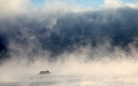 A boat sails across the cold-vaporised Krasnoyarsk Reservoir on the Yenisei River with the air temperature below 20 degrees Celsius (minus 4 degrees Fahrenheit) outside Krasnoyarsk, Russia.18.12.2024#8830564