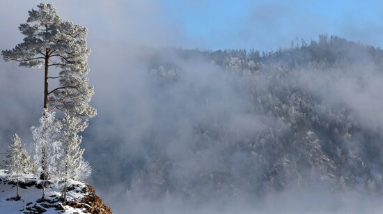 A landscape view shows trees covered with hoar-frost and snow on the banks of the Krasnoyarsk Reservoir on the Yenisei River with the air temperature below 20 degrees Celsius (minus 4 degrees Fahrenheit) outside Krasnoyarsk, Russia.18.12.2024#8830565