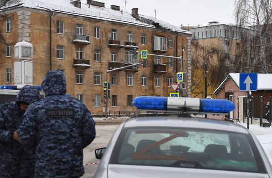 Officers of Russian National Guard Troops stand near a residential building attacked by a drone, in Kazan, Republic of Tatarstan, Russia. The city of Kazan was attacked by eight drones on December 21, including one that hit an industrial facility and six that hit residential buildings, with no casualties recorded so far, the office of Tatar leader Rustam Minnikhanov said.21.12.2024#8833385
