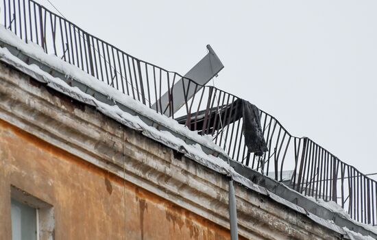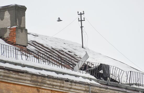 A view shows a damaged roof on a residential building attacked by a drone, in Kazan, Republic of Tatarstan, Russia. The city of Kazan was attacked by eight drones on December 21, including one that hit an industrial facility and six that hit residential buildings, with no casualties recorded so far, the office of Tatar leader Rustam Minnikhanov said.21.12.2024#8833390