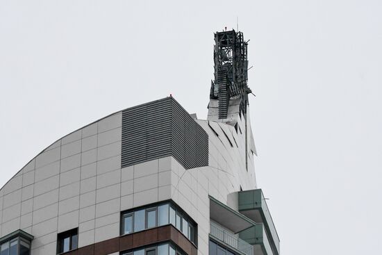 A view shows a damaged roof on a residential building attacked by a drone, in Kazan, Republic of Tatarstan, Russia. The city of Kazan was attacked by eight drones on December 21, including one that hit an industrial facility and six that hit residential buildings, with no casualties recorded so far, the office of Tatar leader Rustam Minnikhanov said.21.12.2024#8833388
