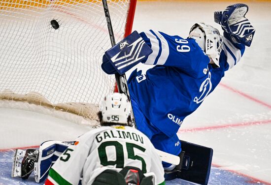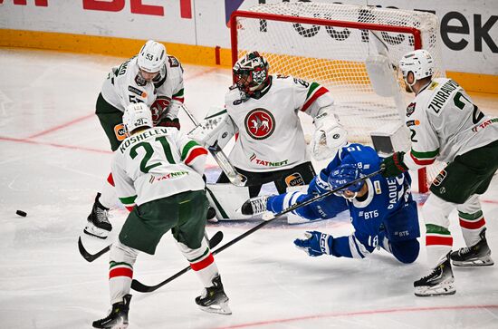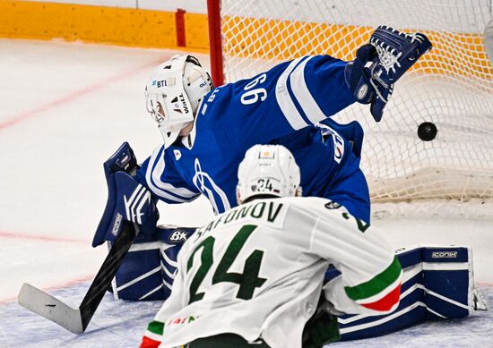 Dynamo's Pavel Kudryavtsev, right, tries to score against Ak Bars' goaltender Timur Bilyalov during the Kontinental Hockey League ice hockey match between Dynamo Moscow and Ak Bars Kazan, in Moscow, Russia.23.12.2024#8835373