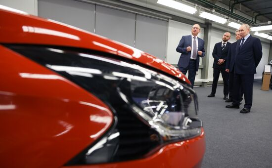 Russian President Vladimir Putin, accompanied by AvtoVAZ First Executive Vice-President for Strategy and Technical Development Evgeny Shmelev, Samara Region Governor Vyacheslav Fedorishchev and AvtoVAZ President Maksim Sokolov, inspects the new Lada Iskra car during a visit to the AvtoVAZ car manufacturing plant in the town of Togliatti, Samara region, Russia.28.01.2025#8847894