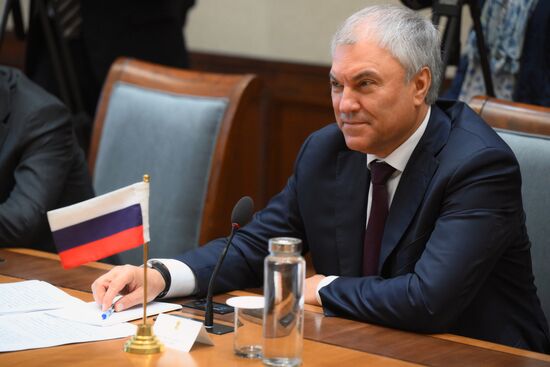Russian State Duma Speaker Vyacheslav Volodin, right, and Lok Sabha, Lower House of Indian Parliament, Speaker Om Birla are seen before a meeting in New Delhi, India.03.02.2025#8850988