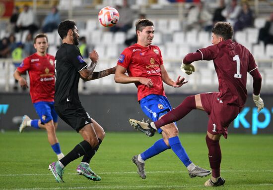 From left, Krasnodar's Vitor Tormena, CSKA's Tamerlan Musaev and Krasnodar's goalkeeper Stanislav Agkatsev in action during the Russian Premier-League Winter Cup third place soccer match between CSKA Moscow and Krasnodar at the Al Nahyan Stadium, in Abu Dhabi, United Arab Emirates.10.02.2025#8856055