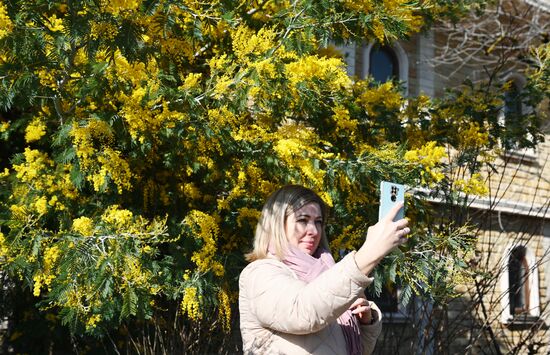 A woman takes a selfie near a blooming mimosa tree at the Sirius federal territory in Krasnodar region, Russia.12.02.2025#8857363