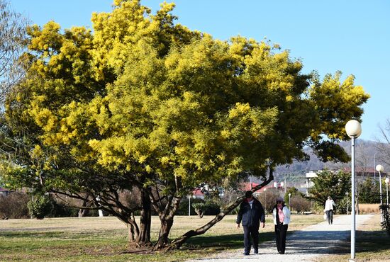 People walk past a blooming mimosa tree at the Sirius federal territory in Krasnodar region, Russia.12.02.2025#8857402