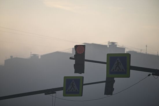 A view shows road signs and traffic lights in the morning mist in the town of Lyubertsy, Moscow region, Russia.28.02.2025#8868074