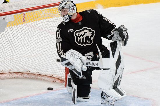 Ak Bars' goaltender Amir Miftakhov tries to catch the puck during the Kontinental Hockey League ice hockey match between Traktor Chelyabinsk and Ak Bars Kazan, in Chelyabinsk, Russia.28.02.2025#8868531