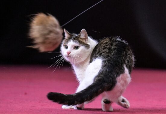 A cat performs in a circus show of the Kindest of Clowns tour, held in Russian cities from March 15 to 31, 2025, as the culmination of celebrations of the 75th birthday of Soviet and Russian clown and cat tamer Yuri Kuklachev, in Kazan, Republic of Tatarstan, Russia.15.03.2025#8879423