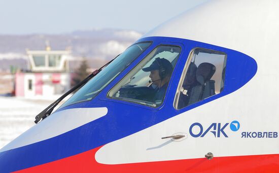 United Aircraft Corporation CEO Vadim Badekha greets test pilots after the first test flight by the prototype of the Sukhoi Superjet New aircraft (SSJ-New) equipped with the domestically-made PD-8 turbofan engine in Komsomolsk-on-Amur, Russia. After Western sanctions prohibited sales of aircraft and aircraft parts to Russia in 2022, Aeroflot signed a contract with Russia's United Aircraft Corporation that provides for the delivery of 339 Russian-made jets by 2030. The deal includes 89 SSJ100s, dubbed SSJ-New.17.03.2025#8880794