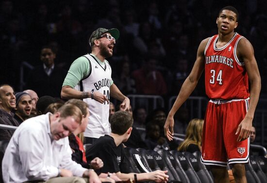 A fan of the Brooklyn Nets team and Milwaukee Bucks player Giannis Antetokounmpo, right, in the National Basketball League match between the Brooklyn Nets (New York, USA) and the Milwaukee Bucks (Milwaukee, USA).27.12.2013#2343981