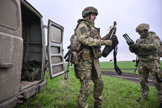 Sappers of the 539 Separate Engineer Battalion of the 42nd Guards Division with the Dnepr Group of the Russian Armed Forces inspect an area for mines and explosive devices amid Russia's military operation in Ukraine, in Zaporozhye region territory, that has accessed Russia.05.04.2025#8897013