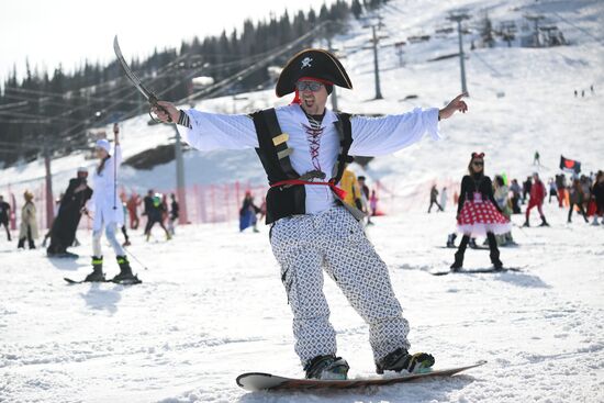 People dressed in carnival costumes take part in a mass downhill on snowboards and skis during the Grelka Fest festival at the Sheregesh ski resort in the Kemerovo region, Russia.11.04.2025#8899390