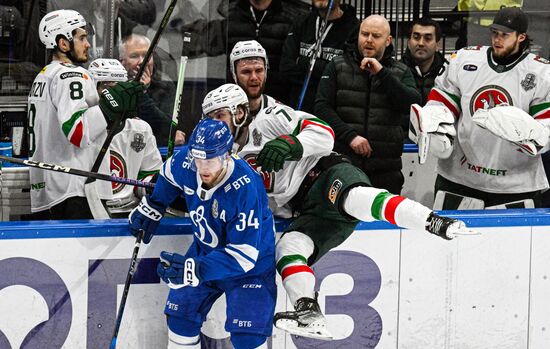 Dynamo's Artyom Ilyenko, left, and Ak Bars' Artur Brovkin are seen during the Kontinental Hockey League quarterfinal ice hockey match between Dynamo Moscow and Ak Bars Kazan, in Moscow, Russia.12.04.2025#8900441