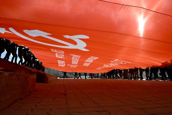 Participants hold a giant replica of Victory standard during a rally through the Hero Cities and Cities of Military Glory of Russia and Belarus dedicated to the 80th anniversary of the victory over Nazi Germany in World War Two in Kazan, Republic of Tatarstan, Russia.14.04.2025#8901530