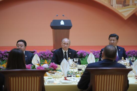 President Vladimir Putin (center, second row) attending the official dinner on behalf of Chinese President Xi Jinping (third row, on rostrum), given at the Shanghai Congress Center in honor of the heads of delegations participating in the 4th Conference on Interaction and Confidence Building Measures in Asia (CICA) Summit, May 20, 2014.20.05.2014#2433656