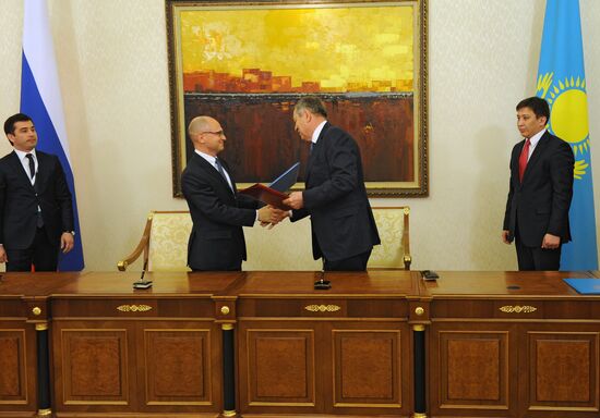 May 29, 2014. CEO of the Rosatom State Corporation Sergei Kiriyenko (second left) and Chairman of the Board of the Kazatomprom National Atomic Company Vladimir Shkolnik (second right) during the ceremony of signing joint documents in Astana.29.05.2014#2439849