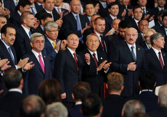 May 29, 2014. Prime Minister of Kazakstan Karim Massimov, President of Armenia Serzh Sargsyan, President Vladimir Putin, President of Kazakhstan Nursultan Nazarbayev, President of Belarus Alexander Lukashenko, President of Kyrgyzstan Almazbek Atambayev (from left to right) during a gala concert in the Astana Opera Theater after the session of the Supreme Eurasian Economic Council in Astana.29.05.2014#2439857