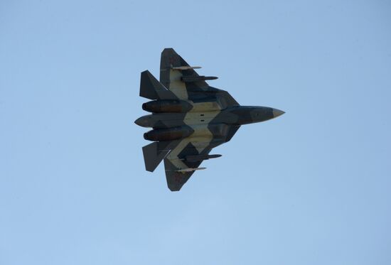 Russian fifth generation T-50 fighter jets at the Aviadarts 2014 international piloting contest at the Air Force Academy base, Voronezh.26.07.2014#2468631