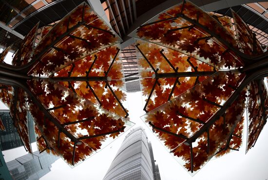 The Federation Tower high-rise complex reflected in the facade of the Mercury City skyscraper in Moscow.09.12.2014#2541040