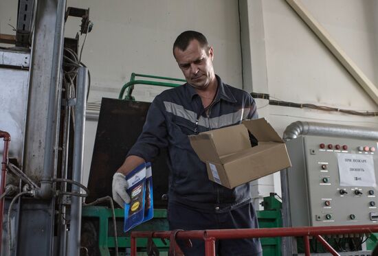 An employee of the Federal Service for Supervision of Consumer Protection and Welfare, right, demonstrates banned products subject to elimination at an incinerator at Pulkovo Airport, St. Petersburg.06.08.2015#2675434