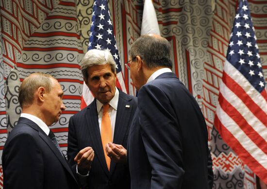 September 28, 2015. Russian President Vladimir Putin, center, Russian Foreign Minister Sergey Lavrov, left, and US Secretary of State John Kerry, right, speak after meeting with US President Barack Obama during the 70th UN General Assembly session in New York City.29.09.2015#2708080