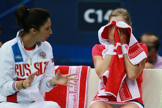 Riki Hogenkamp (the Netherlands), right, in the women's signles match against Svetlana Kuznetsova (Russia) during the Fed Cup quarterfinal between the national teams of Russia and the Netherlands. Left: Russian team captain Anastasia Myskina.06.02.2016#2786388