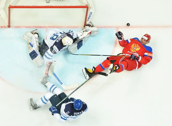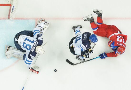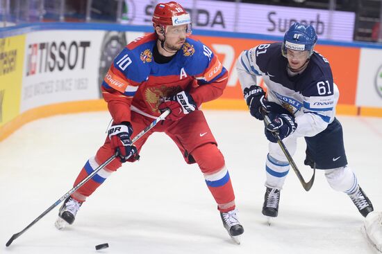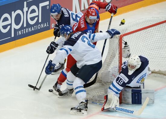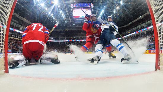 Russia's Sergey Mozyakin, left, and Finland's goalie Mikko Koskinen in the 2016 IIHF World Ice Hockey Championship semifinal between the national teams of Finland and Russia.21.05.2016#2853257
