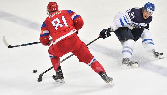 Russia's Dmitry Orlov, left, and Finland's Jussi Jokinen in the 2016 IIHF World Ice Hockey Championship semifinal between the national teams of Finland and Russia.21.05.2016#2853263