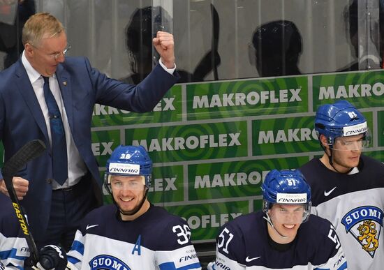 The Finnish team's head coach Kari Jalonen celebrates the team's victory in the 2016 IIHF World Championship semifinal match between the Finnish and Russian national teams.21.05.2016#2853285