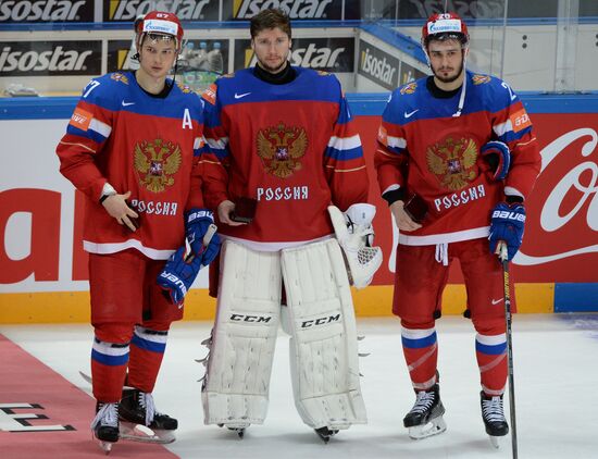 Russia's goalies Ilya Sorokin, left, and Sergei Bobrovsky, right, and player Sergei Mozyakin after the team's defeat in the 2016 IIHF World Championship semifinal match between the Finnish and Russian national teams.21.05.2016#2853280