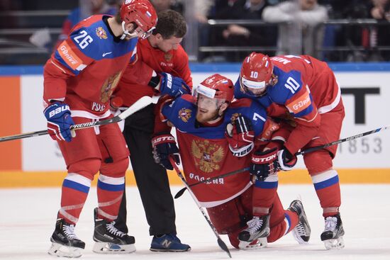 Russia's Ivan Telegin, 2nd right, after receiving an injury during the 2016 IIHF World Championship semifinal match between the Finnish and Russian national teams.21.05.2016#2853311