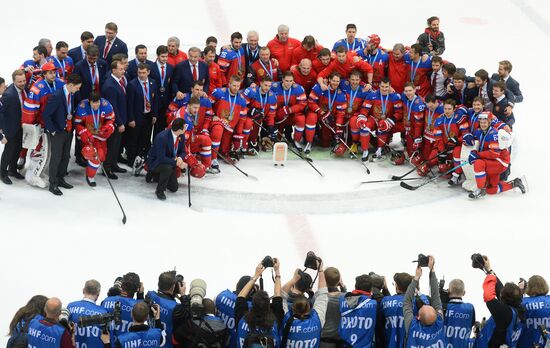Russian players celebrate winning the bronze medals of the 2016 IIHF World Championship.22.05.2016#2853972
