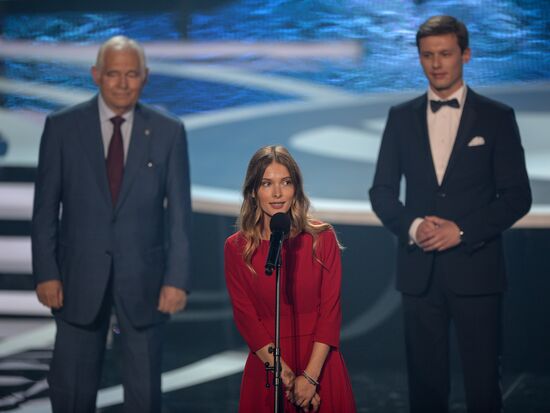 TV hosts Arina Sharapova, Yury Nikolayev and Tatyana Vedeneyeva, right, speak at the Vocation Medical Awards at the Soviet Army Theater in Moscow.16.06.2016#2873886
