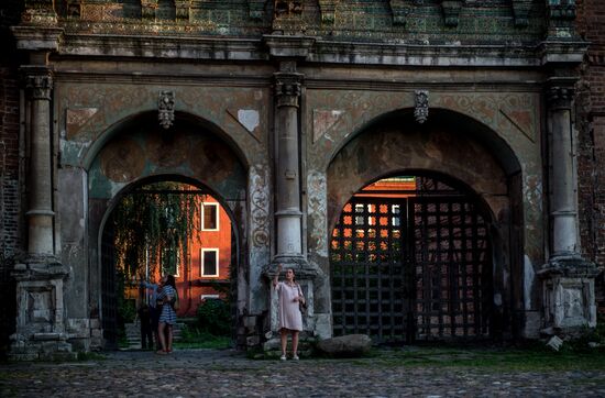 Visitors walk at the Krutitsy Metochion in Moscow. From left: Dormition passage, Holy Gates, Krutitsy House and Metropolitan Chambers.04.08.2016#2904786