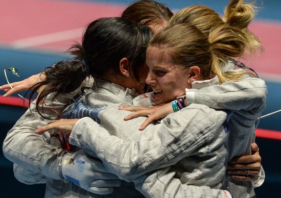 From left: Russia women's fencing team of Sofya Velikaya, Yulia Gavrilova, and Yana Yegoryan celebrate victory in the final of the women’s team sabre fencing tournament against Ukraine at the XXXI Summer Olympics.13.08.2016#2911777