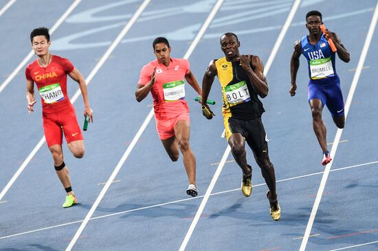 From left: Peimeng Zang (China), Asuka Cambridge (Japan), Usain Bolt (Jamaica) and Trayvon Bromell (USA) during the final heat of the men's 4x100m relay at the XXXI Summer Olympics.19.08.2016#2917400