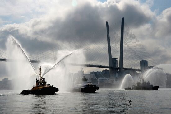 Conditional fire extinguished at a vessel liberated by special forces from terrorists during the opening ceremony of the 2016 Army International military and technical forum in Vladivostok.06.09.2016#2929220