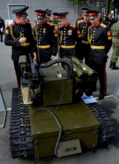 Cadets of the Ussuriysk Suvorov Military School look at the Platform-M robotic unit during the opening ceremony of the 2016 Army military and technical forum in Vladivostok.06.09.2016#2929222