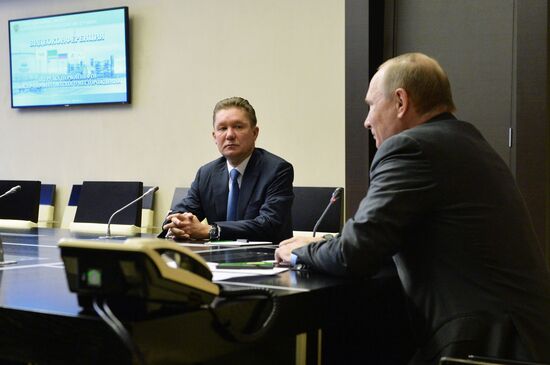 September 21, 2016. Russian President Vladimir Putin, right, and Alexei Miller, Gazprom board chairman, before a video conference during which Vostochno-Messoyakhskoye, Russia's northernmost onshore oil field, is to be launched into production.21.09.2016#2941496