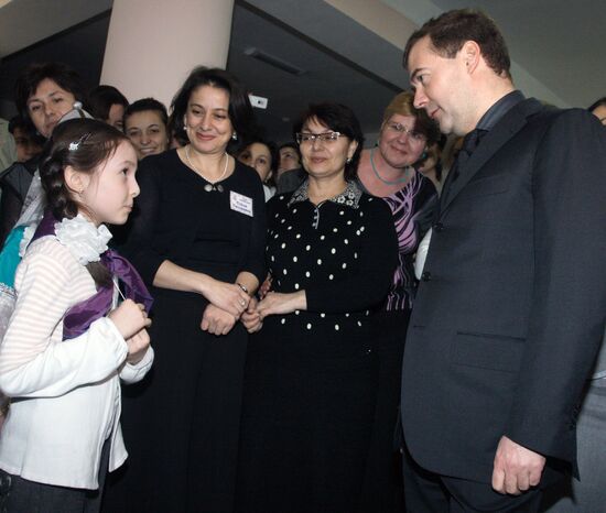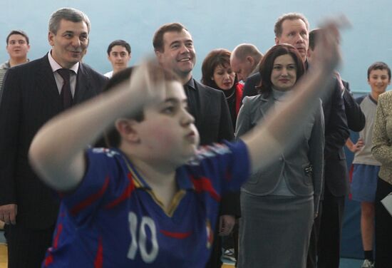 Russian President Dmitry Medvedev, center in the background, visits Nalchik city school.At far left is Arsen Kanokov, President of the Republic of Kabardino-Balkaria, 27 February 2010.27.02.2010#586825