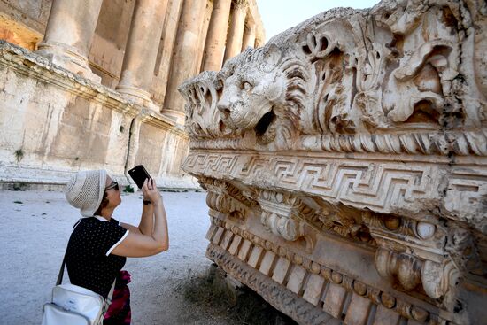 A visitor takes pictures of a bas-relief with heads of lions from the roof of the Temple of Jupiter in a temple complex of Baalbek, Lebanon.26.10.2016#2964559