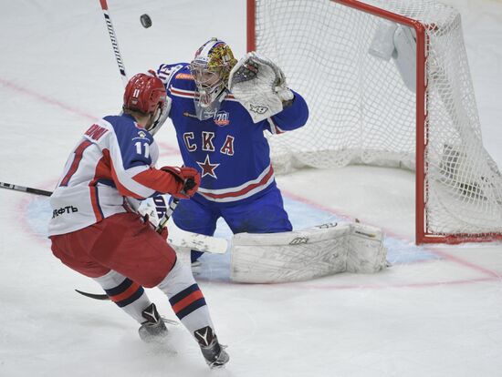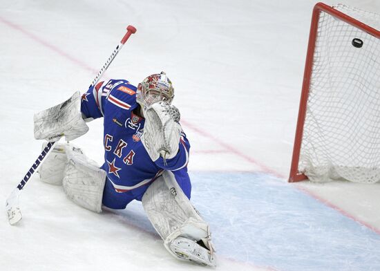 SKA goalie Igor Shestyorki, left, n at the Kontinental Hockey League regular championship match between HC SKA St. Petersburg and PHC CSKA Moscow.21.11.2016#2977682