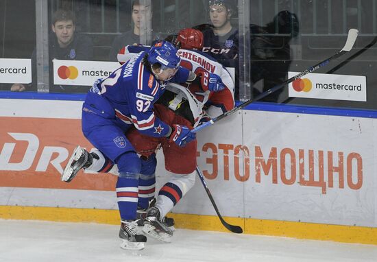 CSKA player Andrei Svetlakov, right, and SKA's player Andrei Zubarev at the Kontinental Hockey League regular championship match between HC SKA St. Petersburg and PHC CSKA Moscow.21.11.2016#2977704
