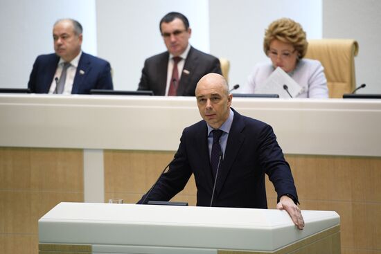 Finance Minister Anton Siluanov, front, at a Council of Federation meeting. Back from left: Deputy Chairperson Ilyas Umakhanov, First Deputy Chairperson Nikolai Fyodorov, Chairperson Valentina Matvienko, deputy chairpersons Yevgeny Bushmin, Yury Vorobyov and Galina Karelova.14.12.2016#2993907