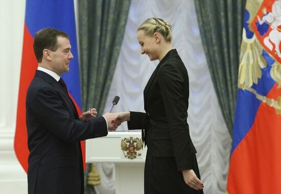 March 15, 2010: Russian President Dmitry Medvedev presents Order of Friendship to Anna Bogaliy-Titovets who won gold at Winter Olympic Games in Vancouver.15.03.2010#598974